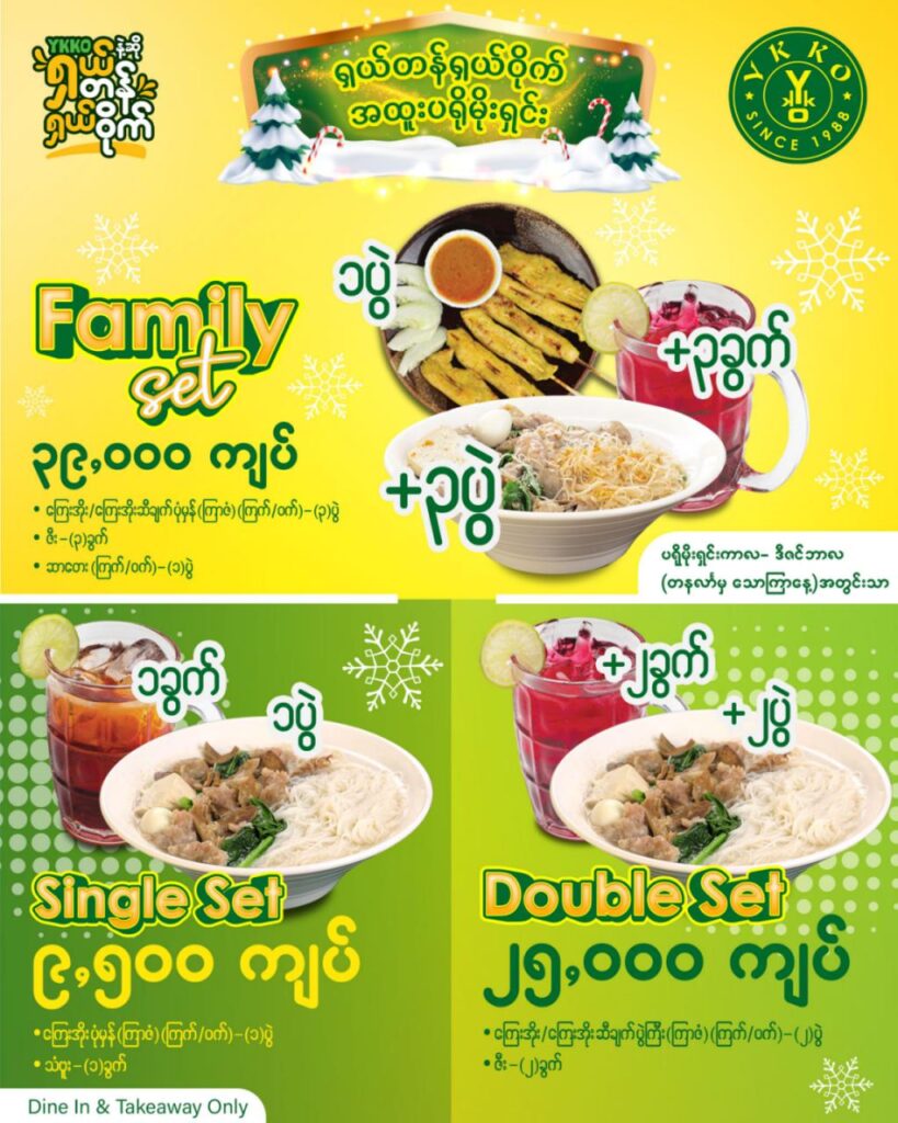Special Combo Set Promotion ကို Sweet December နဲ့ စတင်လိုက်ပြီဗျို့။ လစာထုတ်ရက်မှာ စျေးနှုန်းသက်သာပြီး ရှယ်တန်တဲ့ YKKO ရဲ့ ပရိုမိုရှင်းတွေကို စောင့်မျှော်နေသူတို့အတွက် ဒီဇင်ဘာလ ရဲ့ Special Combo Set ပရိုမိုးရှင်းနဲ့ စတင် မိတ်ဆက်လိုက်ပါပြီ။ Single Set ကြေးအိုး ပုံမှန် (ကြက်/ဝက်)(ကြာဇံ)(၁ ပွဲ) + (သံဗူး ၁ ခွက်) = ၉၅၀၀ ကျပ် Double Set ကြေးအိုး/ကြေးအိုးဆီချက်(ပွဲကြီး)(ကြက်/ဝက်) ကြာဇံ( ၂ ပွဲ)+(ဇီး ၂ ခွက်) = ၂၅,၀၀၀ ကျပ် Family Set ကြေးအိုး/ကြေးအိုးဆီချက် ပုံမှန် (ကြက်/ဝက်) (ကြာဇံ)( ၃ […]